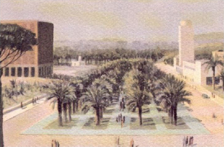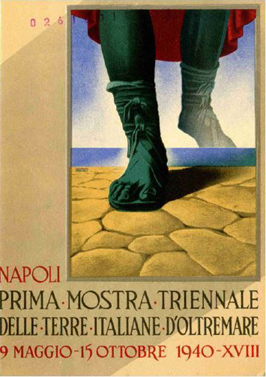 La Mostra triennale delle terre italiane d’Oltremare fu ideata per celebrare le terre d’oltremare e il destino dell’Italia sul mare. Mussolini ne affidò l’organizzazione a Napoli strategicamente ubicata al centro del Mediterraneo, “Porto imperiale, della Roma antica” e quindi considerata punto di partenza ideale per una politica coloniale. La Triennale rientrava in un progetto complessivo in cui si puntava al turismo ed al commercio per lo sviluppo della città che poteva contare su notevoli risorse naturali e culturali. L’idea della Mostra era venuta nel 1937, un anno dopo la fondazione dell’Impero con la conquista dell’Abissinia. Commissario designato per l’Ente Mostra d’Oltremare fu l’ufficiale De Rubeis con il quale si dava inizio al lungo iter progettuale che vide, tra l’altro, l’accendersi di un ampio dibattito sulla scelta del sito su cui edificare la nuova grande iniziativa. Dopo le inevitabili vivaci discussioni, fu scelta la Conca Flegrea – tra Bagnoli e Fuorigrotta – che, per la configurazione pianeggiante, la vicinanza al mare e alle zone archeologiche di Cuma e Averno poteva assolvere meglio di qualunque altra alla funzione di polo turistico e commerciale. La zona, infatti, oltre alla notevole disponibilità di spazi liberi, contava sulla presenza della metropolitana della Società Laziale che avrebbe garantito l’accessibilità del sito e, inoltre, l’intervento a Fuorigrotta si andava ad inserire in un contesto che aveva già una forte vocazione turistica vista la vicinanza con la Terme di Agnano, le stazioni balneari di Bagnoli, Pozzuoli e Lucrino e con le zone archeologiche dei Campi Flegrei. Particolare questo non insignificante, dal momento che colloca storicamente il progetto nell’ambito del più ampio programma di rilancio della città riassunto in 5 punti che Mussolini, con lo slogan “Napoli deve vivere”, aveva elencato nel 1931 ai cittadini napoletani: “Agricoltura, Navigazione, Industria, Artigianato, Turismo”.