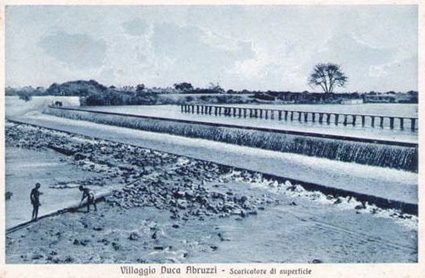 Se il fiume Uebi Scebeli (fiume dei leopardi, il nome in lingua somala) aveva il vantaggio di essere vicino alle città costiere, presentava, invece, uno svantaggio non indifferente dovuto all’intermittenza del suo flusso che alterna una doppia stagione di piena (febbraio-marzo e luglio-settembre) ad una altrettanto doppia stagione di magra durante le quali il fiume giunge ad interrompere la continuità del suo corso. La valorizzazione agricola, legata all’utilizzo delle acque fluviali, era così dipendente dall’immagazzinamento delle acque durante il periodo delle piene. Con la fine della guerra mondiale e la stabilizzazione politica ed economica dell’Italia, ebbe anche inizio il programma di valorizzazione delle nostre colonie e, nel caso in esame, della colonia della Somalia italiana. L’importanza ed il costo delle opere idrauliche necessarie era tale da trascendere le possibilità finanziarie di singoli concessionari. Erano necessari capitali ingenti e la ferma determinazione ad operare investimenti su lungo periodo. Su impulso del Duca degli Abruzzi, venne costituita la S.A.I.S. “Società agricola italo-somala” nel 1920, la quale raggiunse nel 1924 il capitale versato di 35 milioni di Lire ed ottenne una grande concessione di 25.000 ettari. Negli stessi anni venne organizzato il Consorzio agricolo di Genale e vennero realizzate le opere idrauliche di sbarramento del fiume . Due grandi dighe provvidero ad immagazzinare le acque di piena ed a destinarle a mezzo di centinaia di chilometri di canali di irrigazione fino alle più piccole unità organizzate nella regione. Così, in pochi anni, due vasti territori aridi vennero trasformati in due grandi realtà economiche produttive verdeggianti, percorse da centinaia di chilometri di strade, di ferrovie a scartamento ridotto, linee telegrafiche e telefoniche. Per la popolazione colonica somala vennero costruiti decine di villaggi, mentre i centri produttivi e di trasformazione dei prodotti vennero realizzati ex novo ed ebbero il battesimo di Villaggio Duca degli Abruzzi (generalmente abbreviato Villabruzzi) quello della S.A.I.S. e di Vittorio d’Africa, quello del Consorzio di Genale. In questi due centri si concentrava la popolazione dei tecnici e degli amministratori italiani e gli stabilimenti di lavorazione : impianti di sgranatura e pressatura del cotone, oleifici per la spremitura dei vari semi oleosi prodotti (cotone, arachidi, ricino, sesamo, ecc.), saponifici, stabilimenti meccanici per l’assistenza e riparazione delle macchine agricole, centrali elettriche)