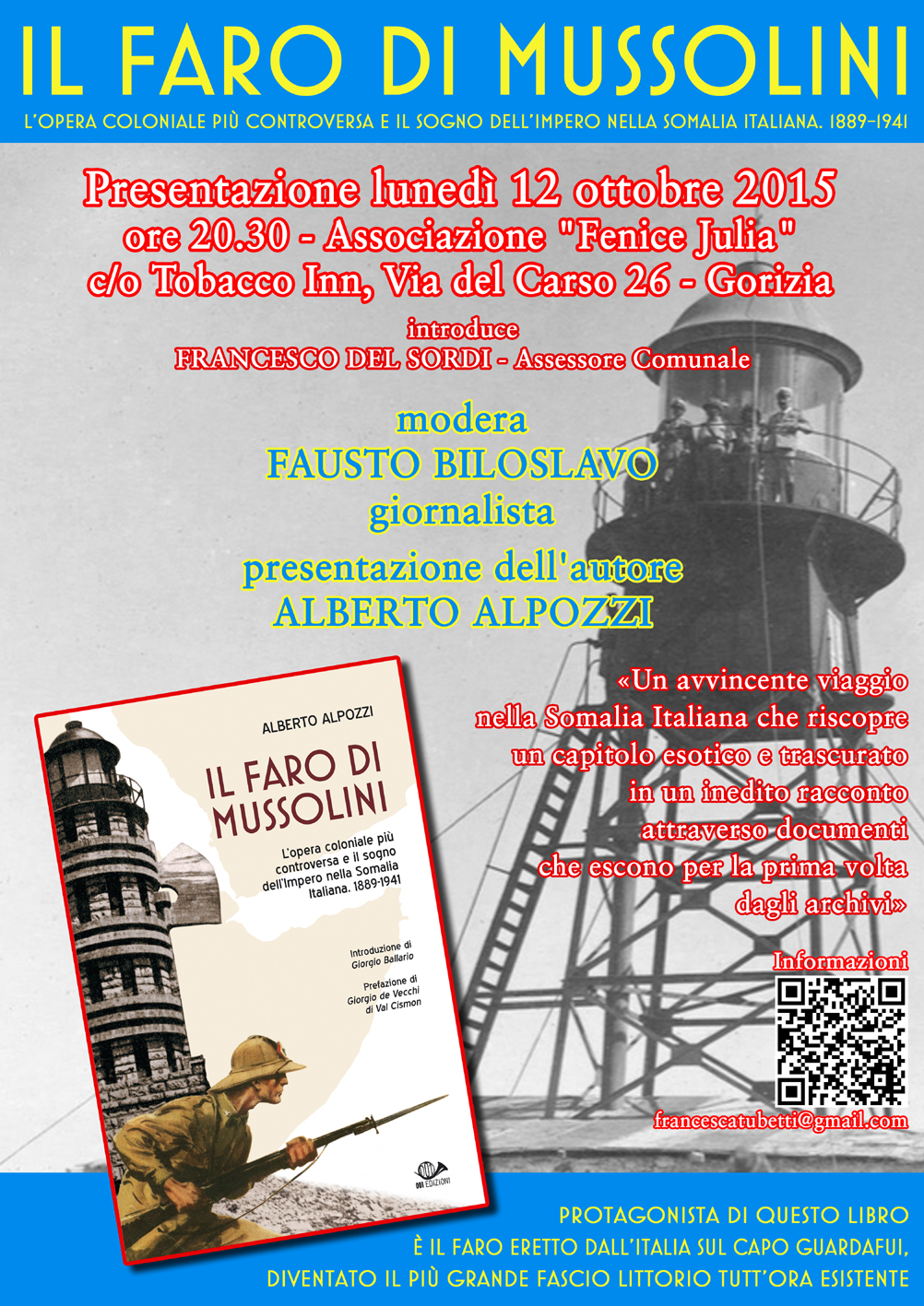 GORIZIA – Lunedì 12 ottobre alle 20.30 presso il Tobacco Inn in via Carso 26 verrà presentato il libro storico “Il faro di Mussolini – L’Opera coloniale più controversa e il sogno dell’Impero nella Somalia Italiana. 1889-1941” del fotoreporter Alberto Alpozzi.