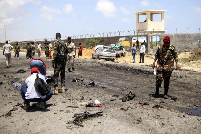 epa07061165 Somali security officers gather at the scene of an explosion in Mogadishu, Somalia, 01 October 2018. A car bomb hit a military vehicle near the Defense Ministry in Mogadishu on 01 October, killing at least one person. EPA/SAID YUSUF WARSAME