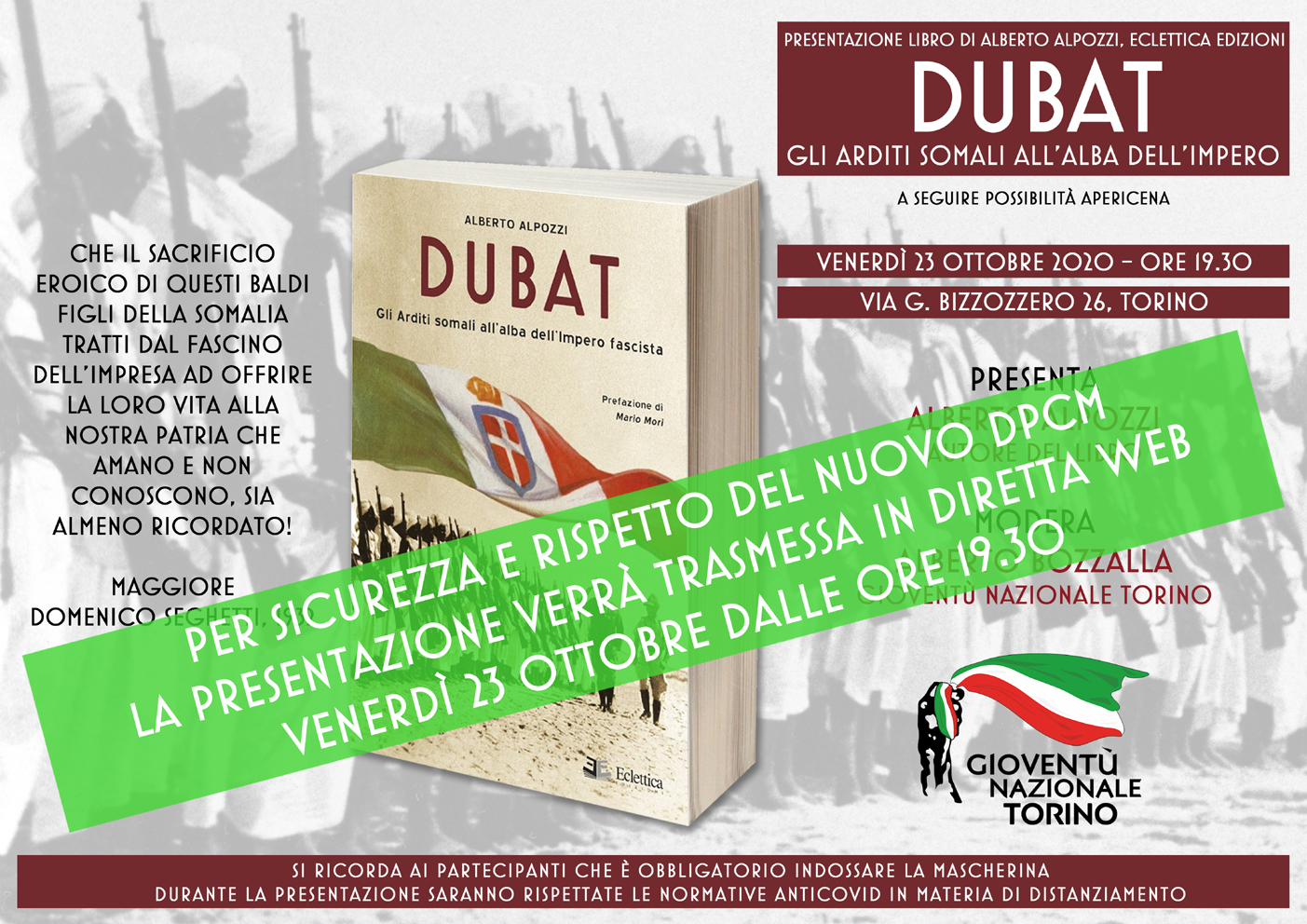 La prima presentazione del nuovo libro di storia coloniale di Alberto Alpozzi, intitolato “Dubat – Gli Arditi somali all’alba dell’Impero fascista” per Eclettica Edizioni, con la prefazione di Mario Mori sarà presentato venerdì 23 Ottobre alle ore 19.30.