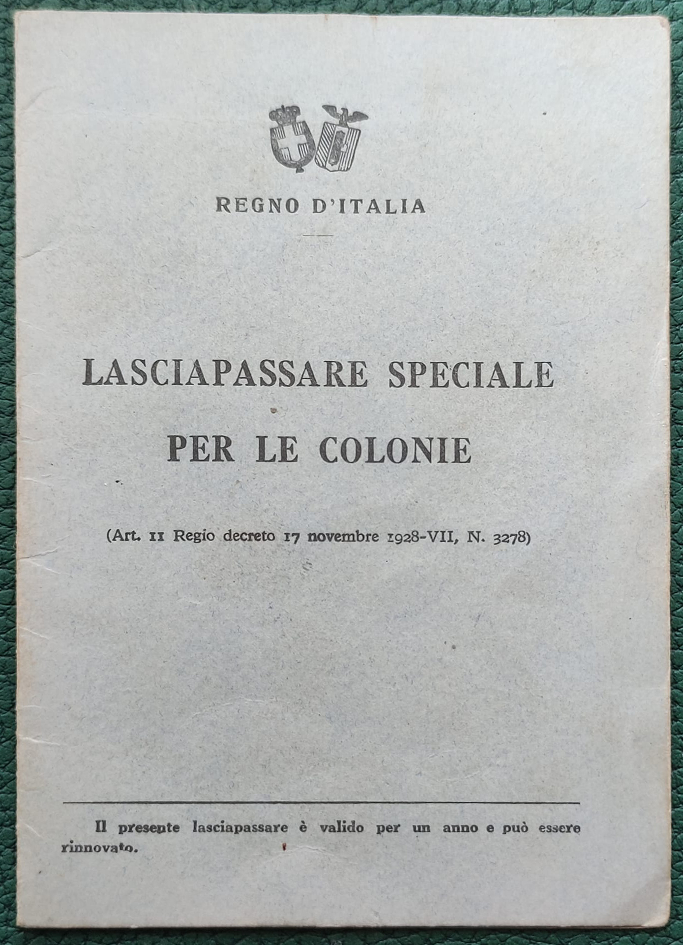 Secondo il Regio Decreto 17 Novembre 1928 n. 3278 per recarsi nelle Colonie italiane in Africa Orientale era necessario un lasciapassare. Tale documento, con due fotografie, andava richiesto, nel Regno, alle Prefetture; nelle colonie, ai Governi, e per i cittadini italiani residenti all’estero, alle Regie Autorità diplomatiche e consolari. Si pagava una tassa di L. 51. Il lasciapassare aveva una validità di un anno.