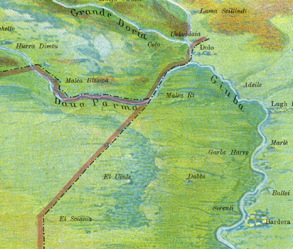 Il confine tracciato fino a Dolo. Estratto dalla veduta panoramica dell’Africa Orientale, A. Vallardi Editore, Milano