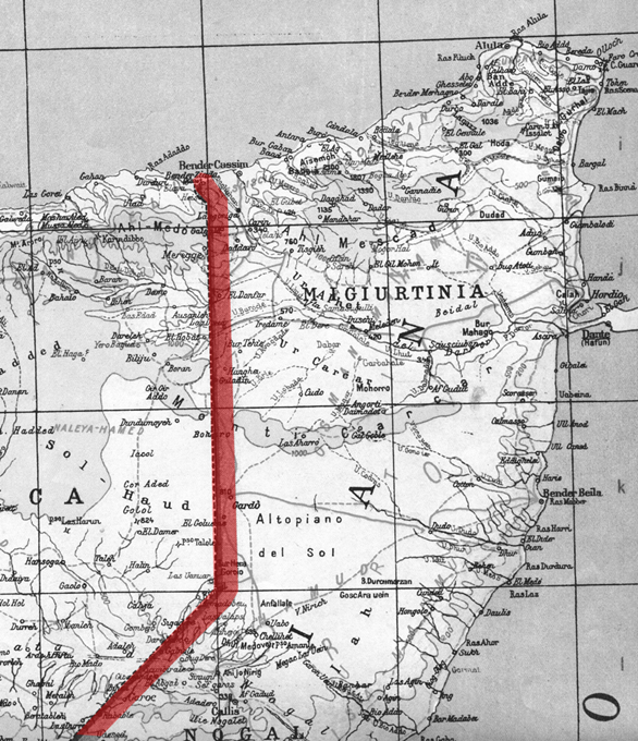 Il confine perfettamente aderente al 49° meridiano tra il Somaliland e la Somalia italiana. Estratto dalla carta fisico-dimostrativa del 1935 redatta da A. Dardano