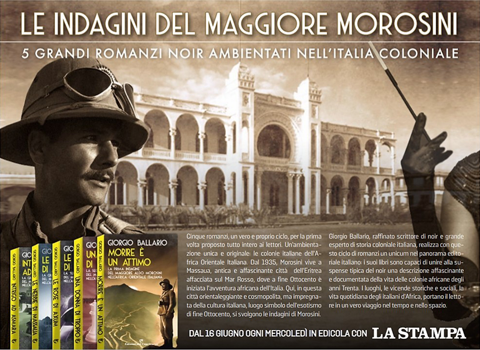 A partire dal 16 giugno, ogni mercoledì, i cinque romanzi della serie coloniale del maggiore Morosini di Giorgio Ballario (pubblicati da Edizioni del Capricorno) saranno in edicola in abbinamento con undici quotidiani a soli 9,90 euro. I libri – gialli storici ambientati nelle colonie italiane in Africa negli anni Trenta – verranno distribuiti con i giornali del gruppo GNN (Gedi News Network), vale a dire La Stampa, Il Secolo XIX, Il Mattino di Padova, La Nuova Venezia, La Tribuna di Treviso, Il Corriere delle Alpi di Belluno, Il Piccolo di Trieste, Il Messaggero Veneto di Udine, La Gazzetta di Mantova, La Provincia Pavese e La Sentinella del Canavese.