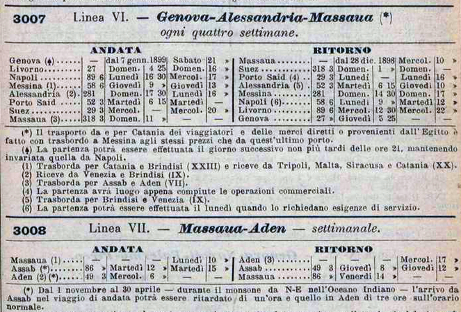 In dettaglio, nel 1938 c’erano le seguenti linee che toccavano i porti eritrei e somali: