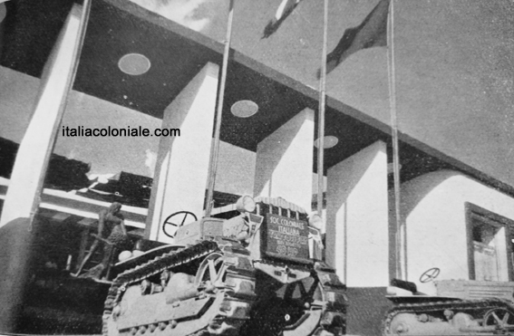 Oltre alla Mietitrebbia, la S.C.I. ha esposto i trattori a cingoli «Fiat-Boghetto» 40 HP. con motore policarburante (benzina, nafta, petrolio e alcol). Da notare che, fino a quel momento, l’Italia era legata all’industria estera in fatto di trattrici. La S.C.I. espose anche la «Mietilega-Laverda », falciatrici «Laverda», seminatrici, aratri, monovomeri, bivomeri e trivomeri «Martinelli», Molini «Vottero» a mano per gli indigeni e motoseghe «Balilla», tutti macchinari costruiti per conto della S.C.I. per le Colonie in seguito alle esperienze dirette della Coloniale Agricola nelle proprie aziende.