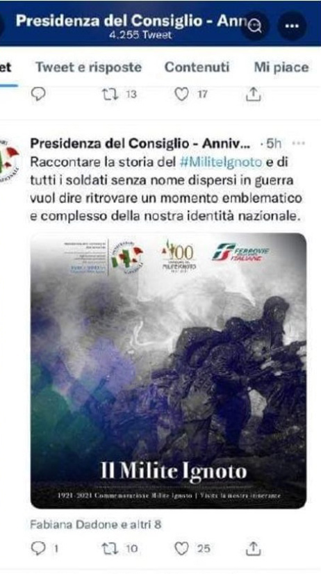 Già sparita dal profilo social della Presindenza del Consiglio dei Ministri la locandina per il Centenario del Milite Ignoto (1921-2021).