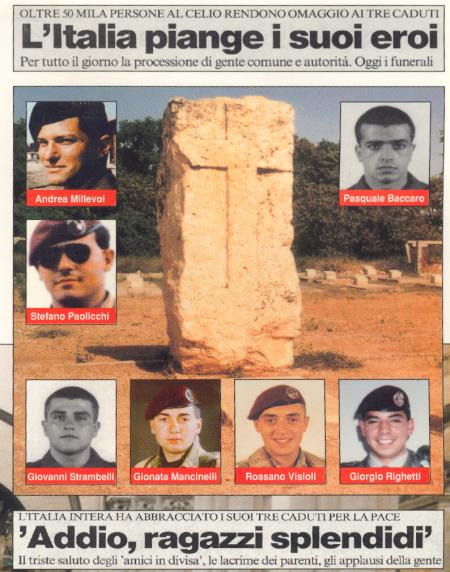 Paracadutista Giovanni Strambelli, Sotto Tenente Andrea Millevoi, Sergente Maggiore Stefano Paolicchi, Paracadutista Pasquale Baccaro, Paracadutista Jonathan Mancinelli, Caporale Paracadustista Rossano Visioli, Caporale Paracadutista Giorgio Righetti, Sergente Maggiore Roberto Cuomo, Maresciallo Capo Vincenzo Licausi, Lanciere Tommaso Carozza e Tenente Giulio Ruzzi. Cadde anche l’infermiera volontaria delle Croce Rossa Sorella Maria Cristina Luinetti ed è anche doveroso ricordare l’assassinio della giornalista Ilaria Alpi e del suo operatore Miran Hrovatin.