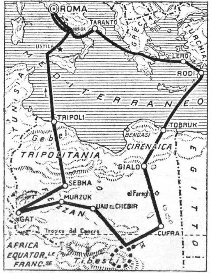 Lo scopo era il sorvolo delle catene montuose del Tibesti, territorio montuoso al centro del Sahara, divenuto oggetto di discussione con la Francia che, approfittando della guerra contro i ribelli in Cirenaica, pensò di far valere diritti territoriali nel sud libico mettendo dei presidi per il tempo che il clima inclemente della zona gli permetteva.