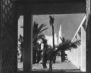 Mentre camminando tramite questi spazi, c’è una scena unica che si sta formando, questa scena è l’immagine principale del padiglione che è stata formata perfettamente dopo aver scelto elementi speciali dall’architettura locale di Libia, e mostrati come lo skyline di una città mediterranea alle cui sponde ti stai avvicinando e per mostrare la sua immagine piano piano: minareti, palme, cupole ecc. formano una scena presente in tutta la Libia tramite l’architettura.