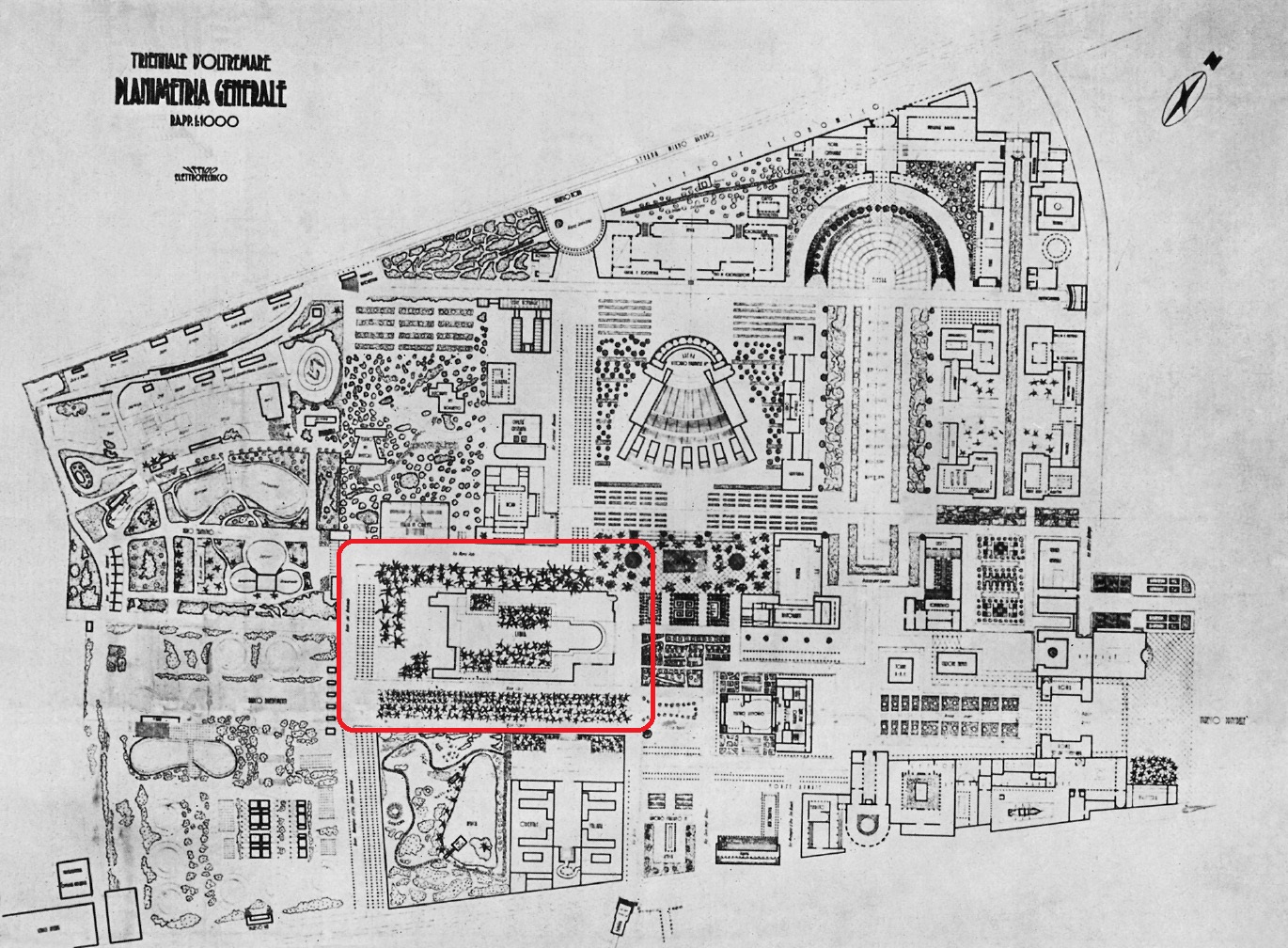 All’inizio, troviamo l’idea dell’oasi, il motivo principale con cui di Fausto ha deciso di usare le palme e portarle dalla Libia per essere elemento principale nel disegno: è stato messo dentro lo spazio centrale del padiglione come se fosse un cortile.