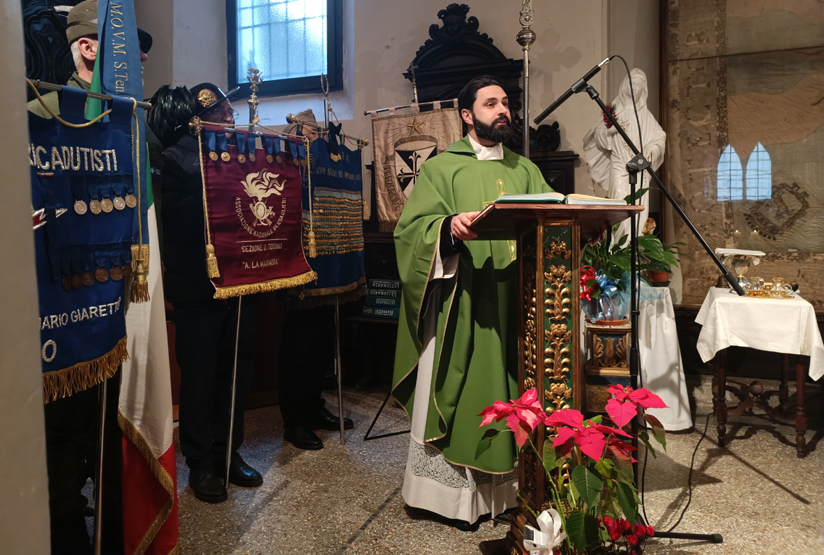 L’altare è cinto dai labari dell’Associazione Nazionale Volontari di Guerra Fed. Prov. Torino, della Federazione Nazionale Arditi d’Italia Fed. Prov. Torino, dell’Assocazione Nazionale Reduci e Rimpatriati d’Africa, dell’Unione Nazionale Ufficiali in Concedo d’Italia sez. Torino, della Gruppo Croce Bianca, dell’Associazione Nazionale Paracadutisti d’Italia sez. di Torino, dell’Associazione Nazionale Bersaglieri d’Italia di Torino e dell’Associazione Legionari MVSN GNR gruppo di Torino.