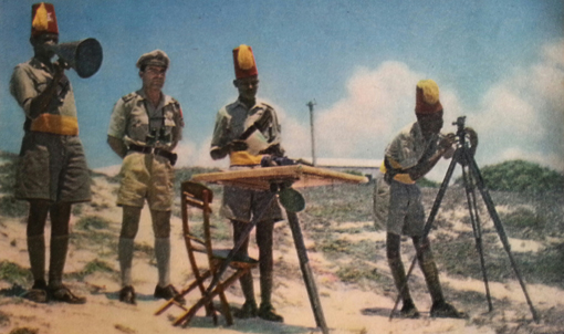 Essi vengono istruiti in una aula del «Quarto». Stanno seduti, ai loro banchi intenti alla lezione; alcuni hanno inforcato gli occhiali per vedere meglio quanto un nostro tenente disegna sulla lavagna. Gente di quaranta e cinquant’anni. Sul banco tengono un quaderno, di tanto in tanto scrivono sotto dettatura. Scrivono non male o anche bene; debbono assimilare concetti d’una certa difficoltà. Per esempio, il somalo non capisce agevolmente in che cosa consistano due rette parallele, perché il parallelismo esula dal paesaggio della Somalia. Poi, studiare a quaranta o a cinquant’anni i principi generali e particolari del tiro d’artiglieria, riesce gravoso chiunque.