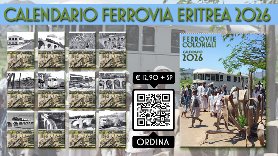 Dodici immagini per illustrare uno straordinario capolavoro mondiale di ingegneria ferroviaria, realizzato in un ambiente estremamente ostile e con un grande dislivello: Asmara si trova a 2.300 slm. Realizzata tra il 1887 e il 1911 dal Genio Militare e del Genio Ferrovieri. Acquistando il “Calendario 2026 – Ferrovie coloniali″ contribuirai a finanziare la ricerca storica su un capitolo della storia d’Italia troppo spesso trascurato e parzialmente divulgato: la storia coloniale italiana. Il tuo contributo inoltre permetterà il mantenimento di questo sito di divulgazione storico e i canali social ad esso collegati.